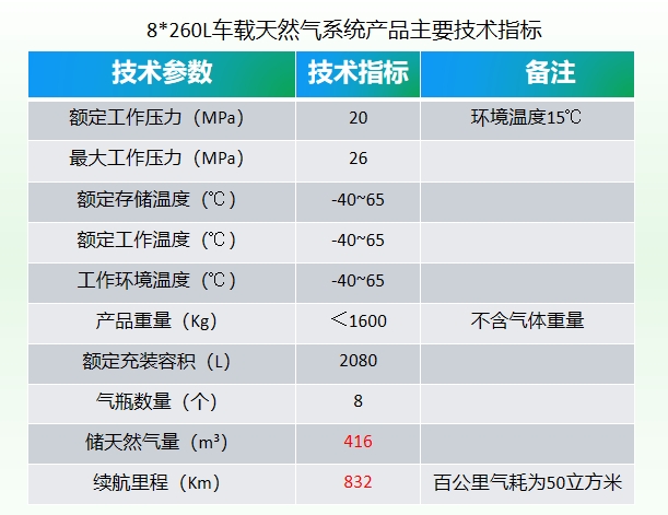 8*260L車載壓縮天然氣系統(tǒng)產(chǎn)品搭載8只260L、20MPa的車用壓縮天然氣鋼質(zhì)內(nèi)膽環(huán)向纏繞氣瓶/天然氣鋼質(zhì)內(nèi)膽碳纖維全纏繞氣瓶,由螺接式的主體框架支撐,裝載在駕駛室后側(cè),天然氣儲(chǔ)氣量416m3,可維持車輛832KM以上的續(xù)航里程,該產(chǎn)品具有結(jié)構(gòu)強(qiáng)度可靠;氣瓶拆裝更換便捷;總體結(jié)構(gòu)輕,環(huán)境適應(yīng)能力強(qiáng)、安全性高等特點(diǎn),廣泛應(yīng)用于31T以上的重型車輛。